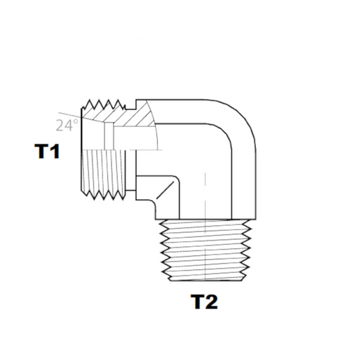 FEATURES Adapter Type: Male DIN Heavy to Male NPT 90° Thread 1: M24 X 1.5 Thread 2: 1/2-14 Material: Steel Max Pressure: 5000 PSI