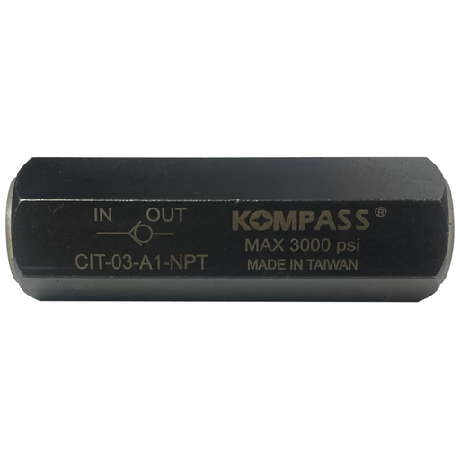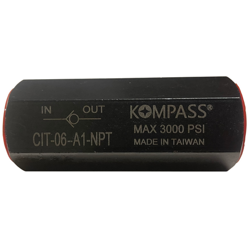 Kompass Hydraulics In-Line check valve. Allows flow in one direction and prevents flow in opposite direction. High pressure steel body construction...
