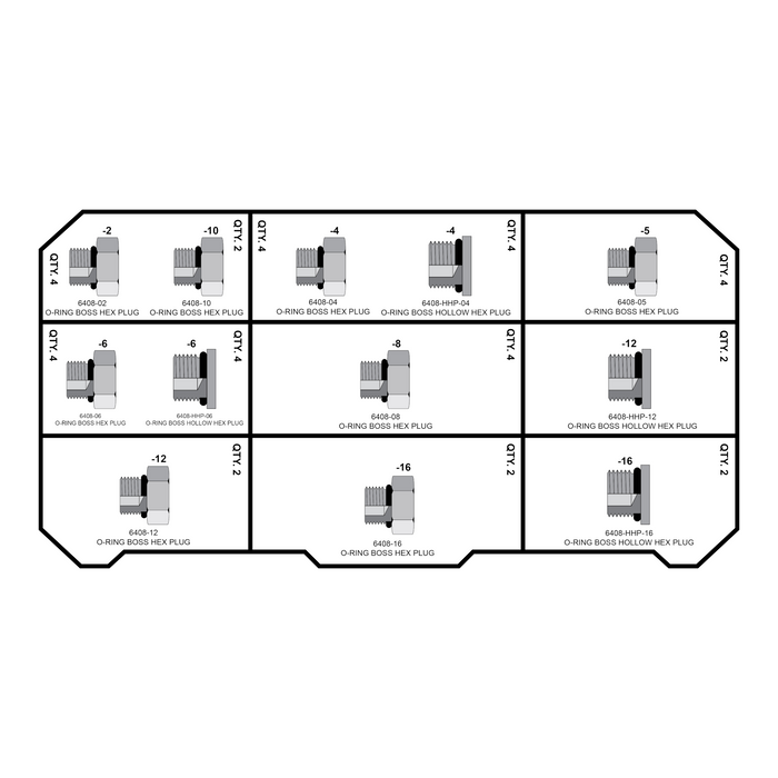 · Fitting Packs feature a wide variety of hydraulic seals and adapter fittings in sizes ranging from -4 (1/4”) to -16 (1”).